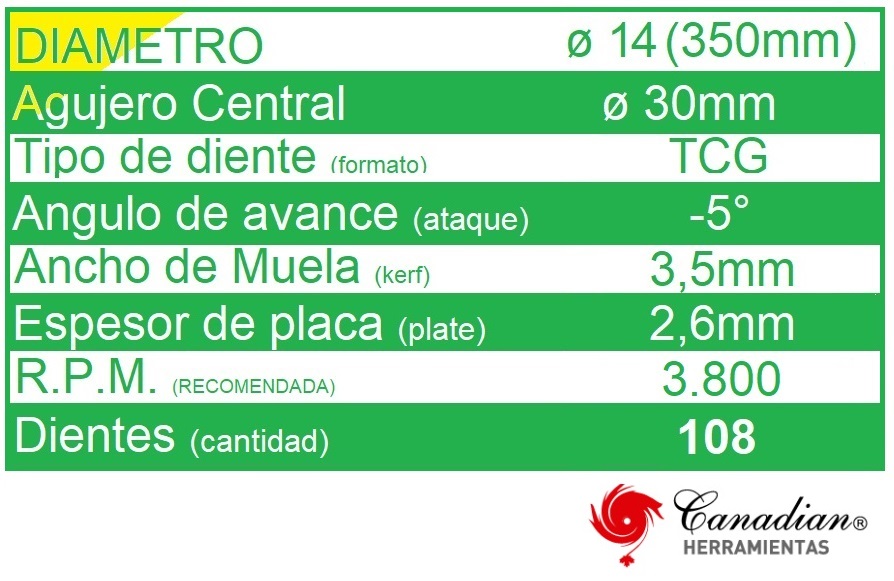 Sierra circular INDUSTRIAL con inserto de carburo de tungsteno (formato del inserto del diente TCG triple chip grind/ triple instancia de corte de súper espesor) intercala a lo largo de todo su recorrido un diente facetado, con uno recto, con diferencia de altura entre ambos, lo que genera un pulido suave y paulatino. La placa de doble espesor y tratamiento térmico posee ranuras láser que absorben vibración y ruido, proveen mayor firmeza y prolijidad en el corte.