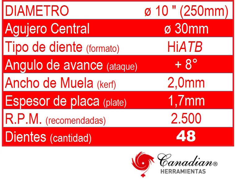 Sierra circular con inserto de carburo de tungsteno (formato del inserto del diente ATB alternate top bebel / filo superior alternado) intercala corte izquierdo-derecho en todo su recorrido con un doble biselado (filo) en cada diente para un pulido paulatino.