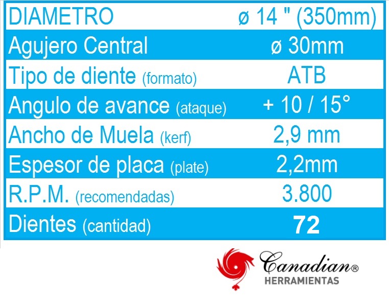 Sierra circular con inserto de carburo de tungsteno (formato del inserto del diente ATB alternate top bebel / filo superior alternado) intercala corte izquierdo-derecho en todo su recorrido con un biselado (filo) de 15º.